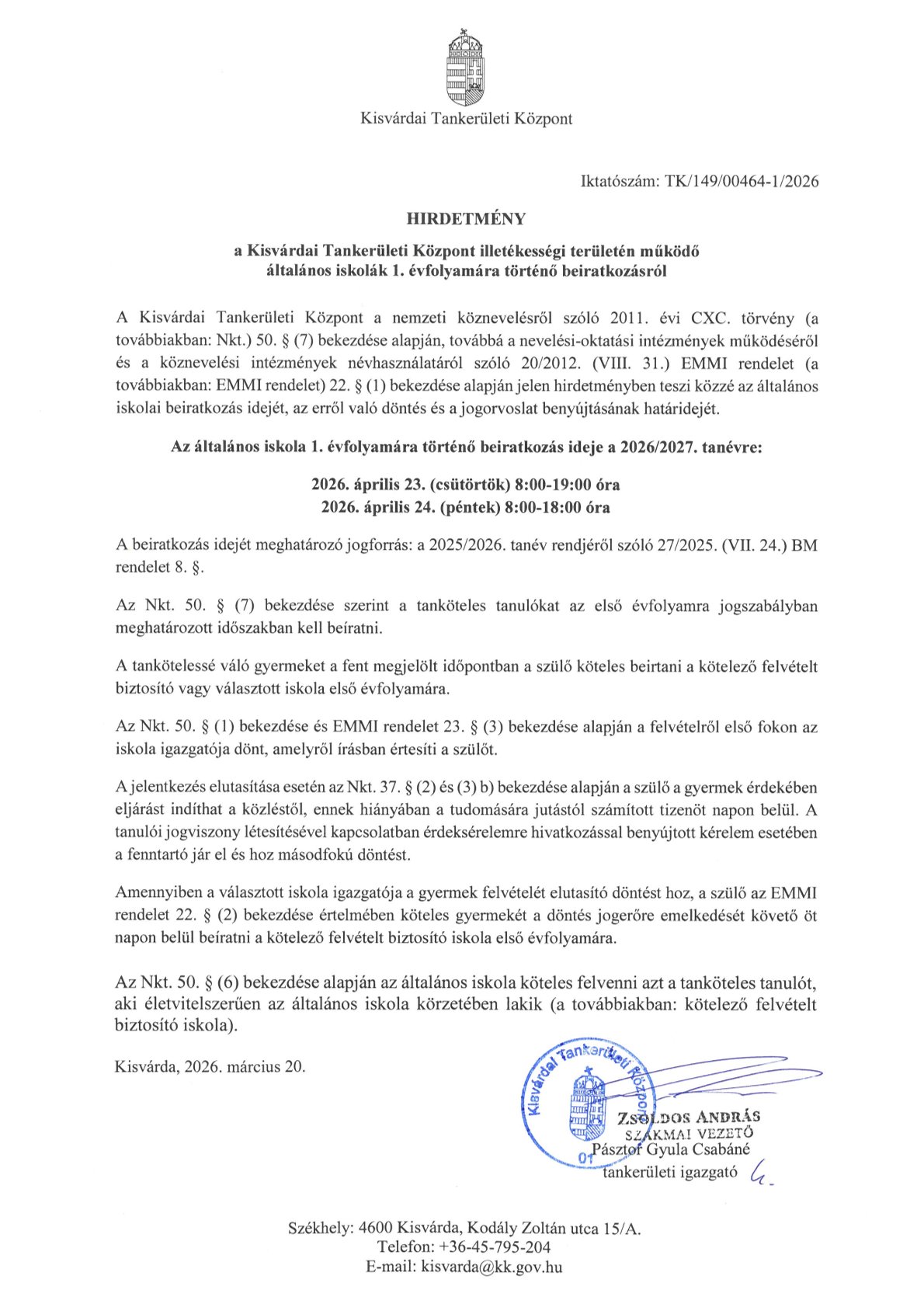 Általános iskolai beiratkozás - szülői tájékoztató